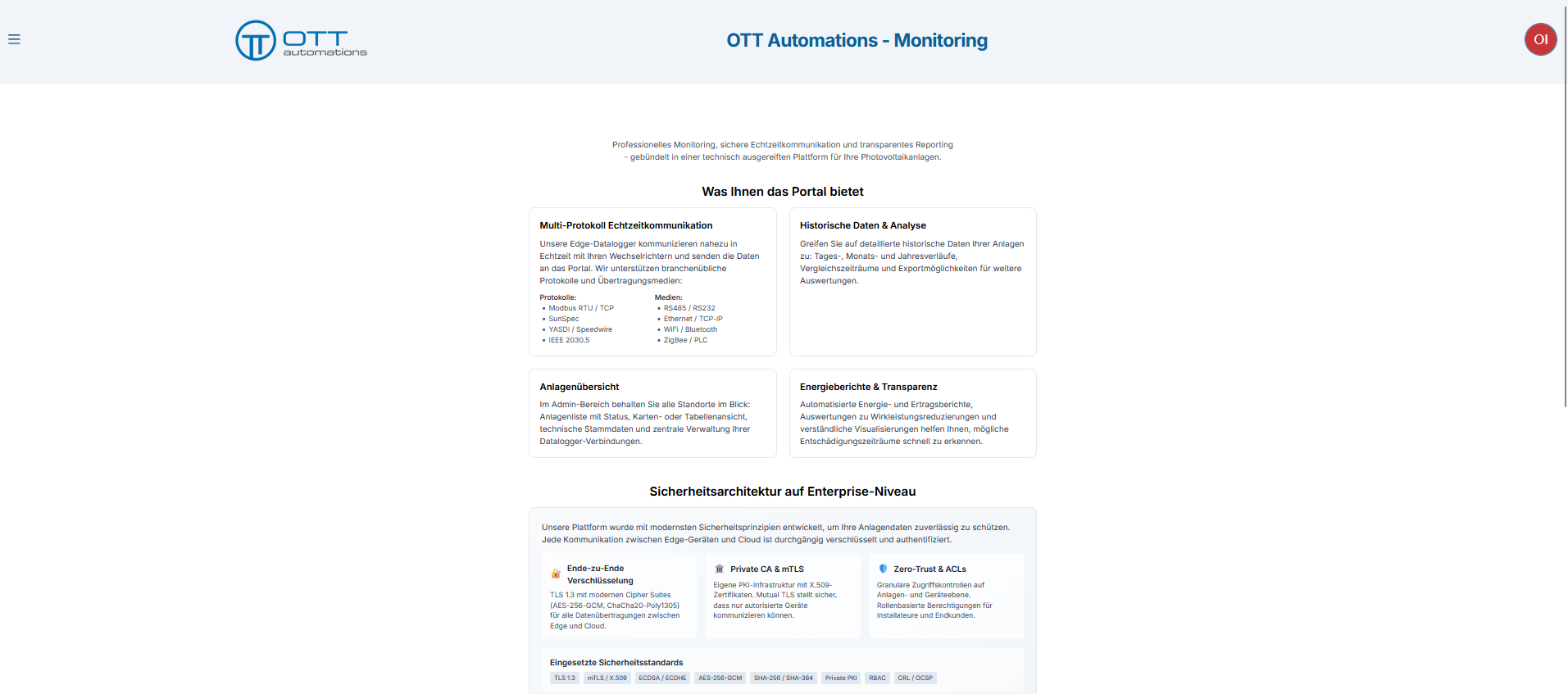 Wechselrichter-ProtokolleModbus RTU, Modbus TCP, SunSpec, SMA, SiemensPhysische SchnittstellenRS485, Ethernet, WiFiSicherheitTLS 1.3, mTLS, PKI (EJBCA), Noise-ProtokollEdge-HardwareRaspberry Pi (ARM64), Custom LinuxDatenspeicherInfluxDB (pro Gerät), PostgreSQLIdentitätOIDC/OAuth 2.0, Authentik, PKCE